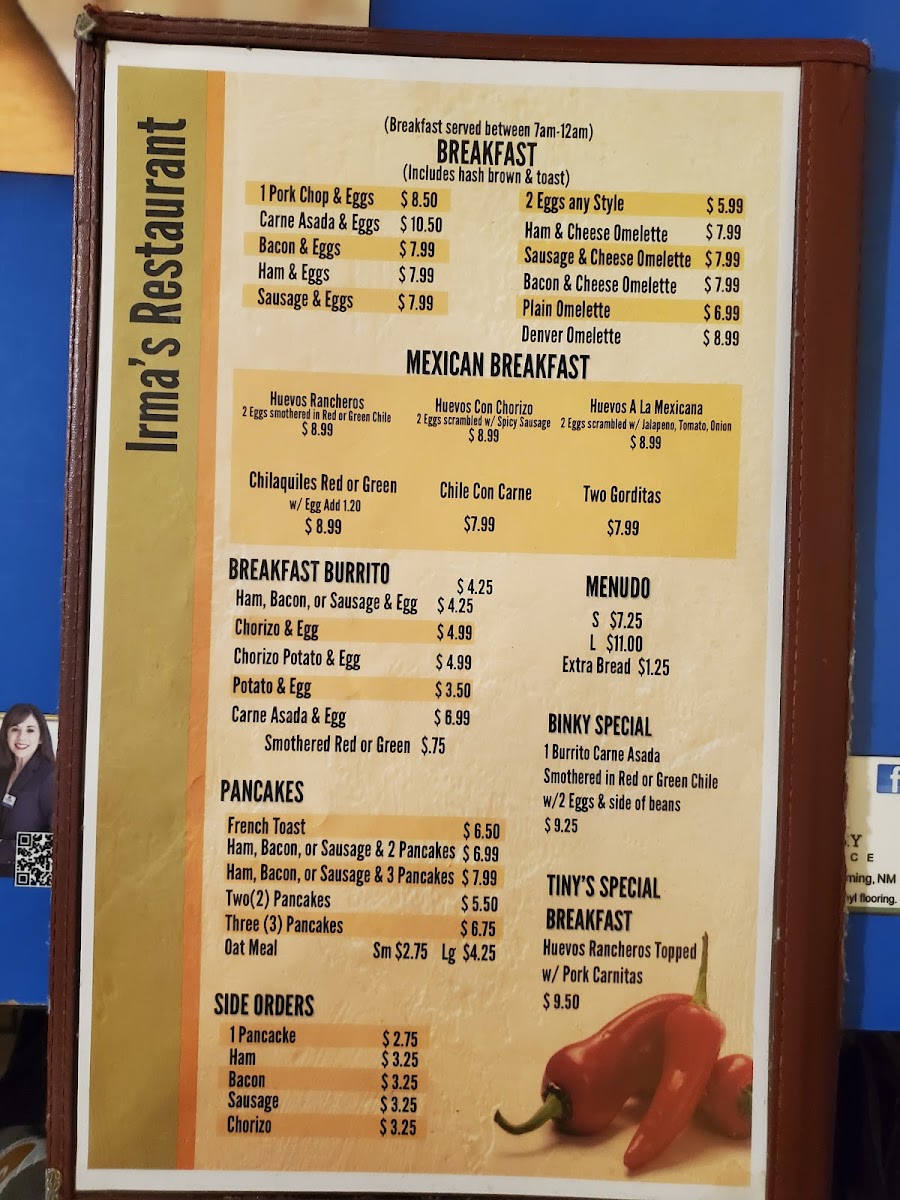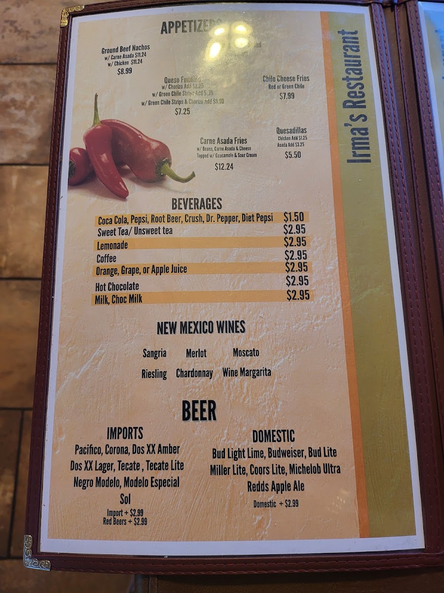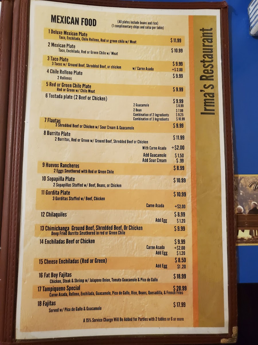 Welcome to Irma's Restaurant, a hidden gem nestled in the heart of Deming, New Mexico. This charming eatery captures the essence of authentic Mexican cuisine, with a menu designed to delight every palate. The moment you step through the door, you’re greeted with a warm atmosphere and the aromatic scent of traditional dishes.