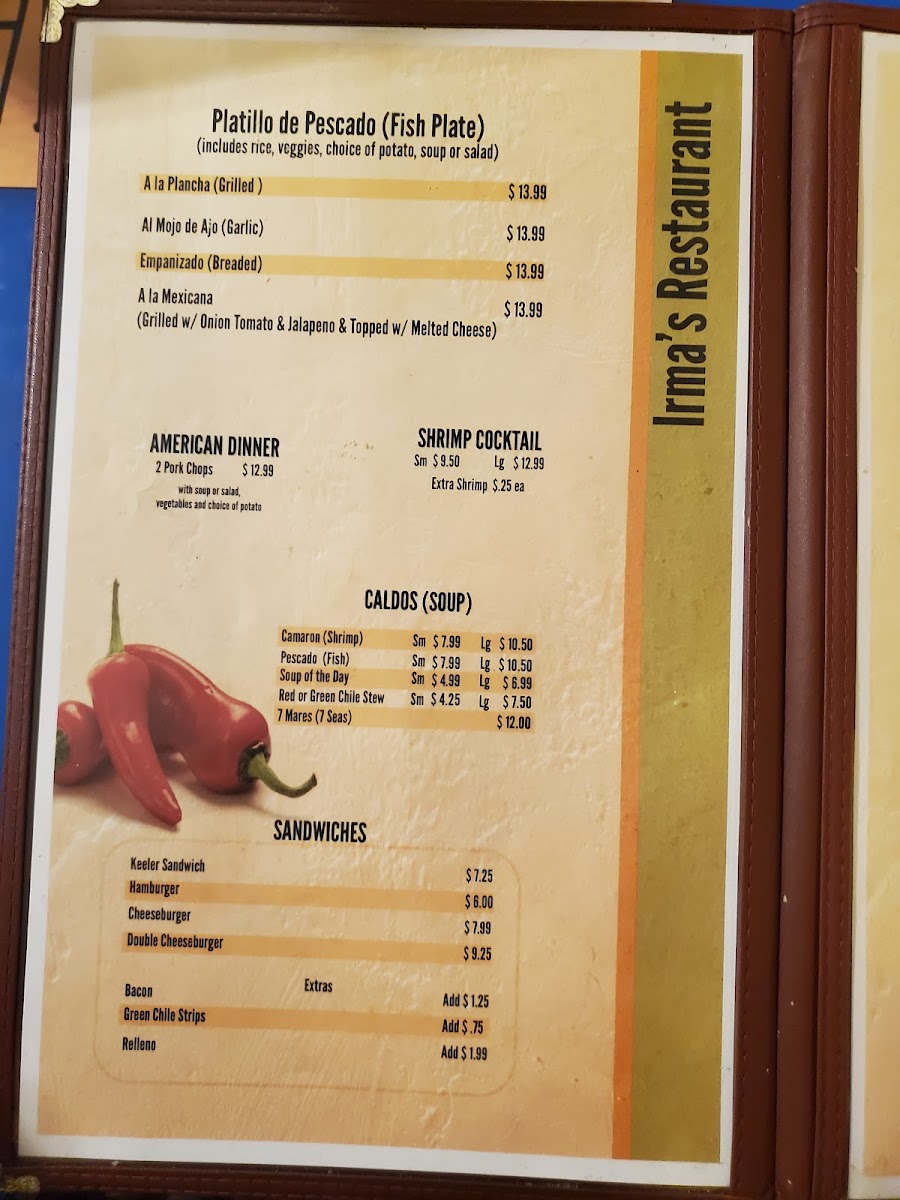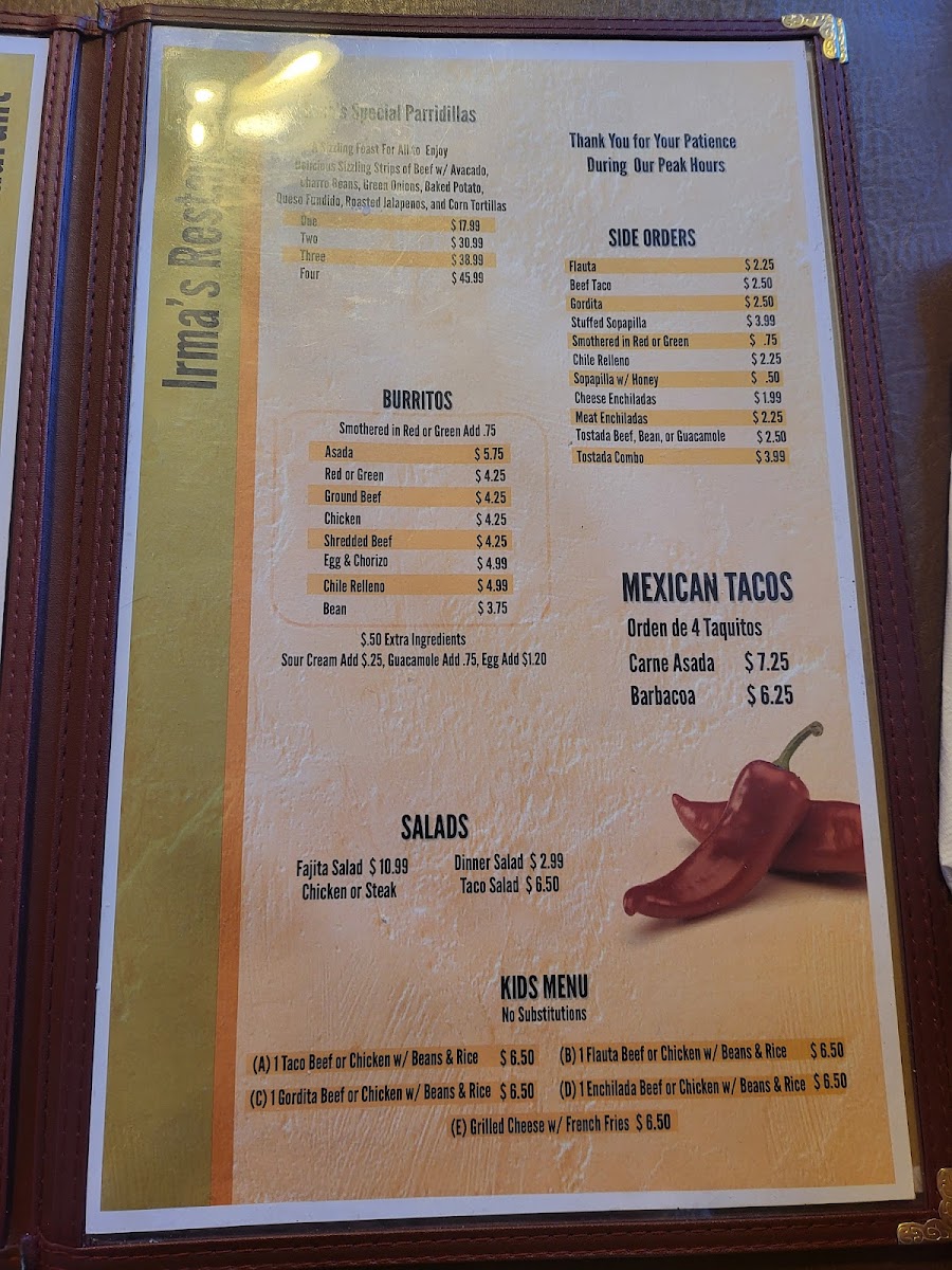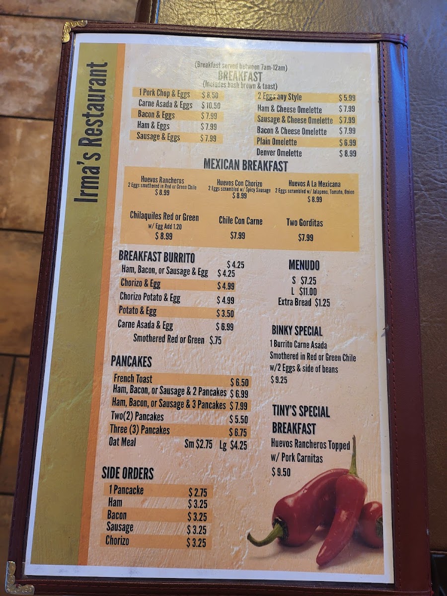 Welcome to Irma's Restaurant, a hidden gem nestled in the heart of Deming, New Mexico. This charming eatery captures the essence of authentic Mexican cuisine, with a menu designed to delight every palate. The moment you step through the door, you’re greeted with a warm atmosphere and the aromatic scent of traditional dishes.